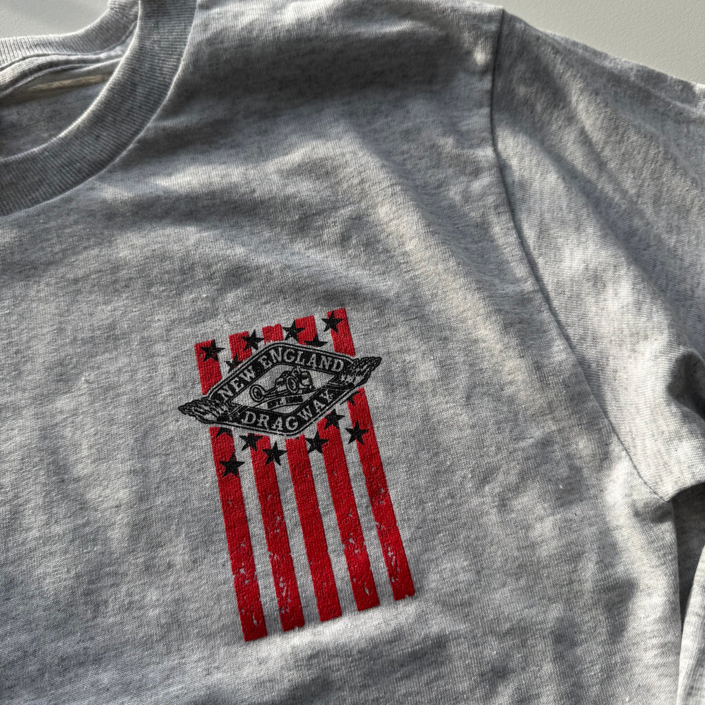 The Stars & Stripes 2.0 long sleeve tee combines patriotic style with racing pride. Featuring a bold distressed American flag and the New England Dragway logo on both the front and back, it’s perfect for fans who want to make a statement.
